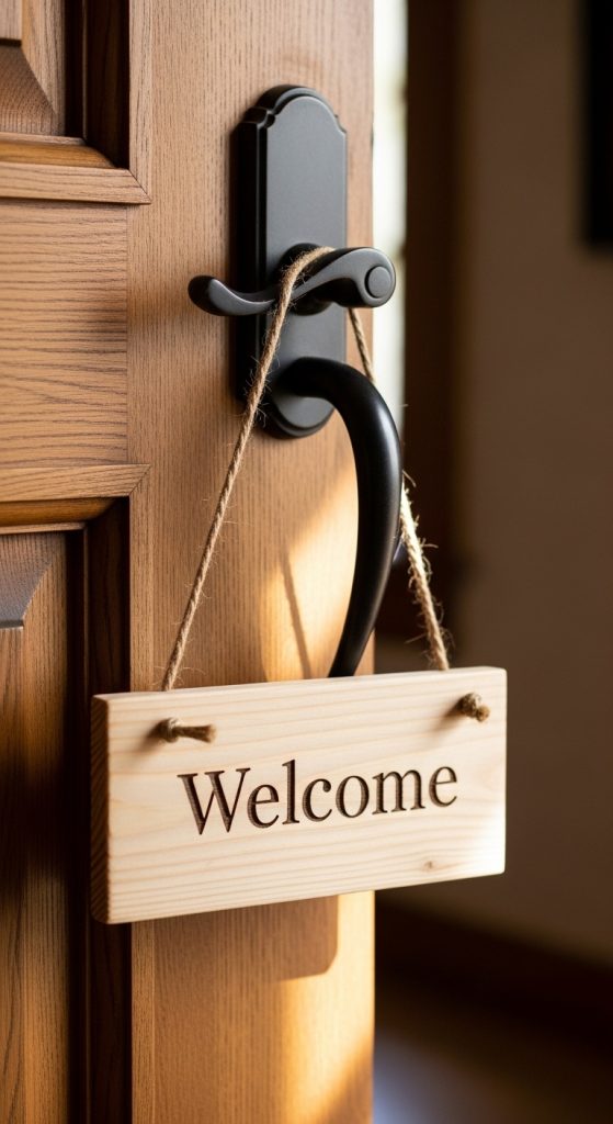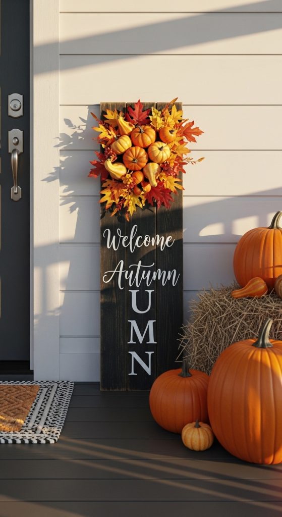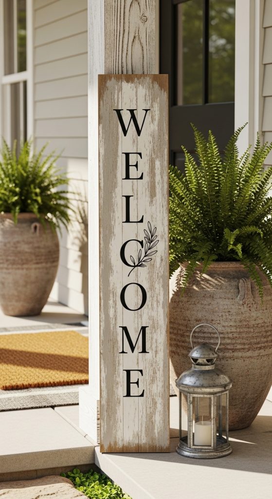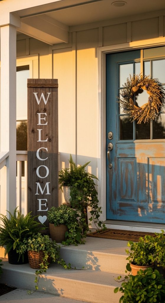 A tall wooden porch sign is one of the most timeless front door decorations. It’s simple, bold, and perfect for any home style.