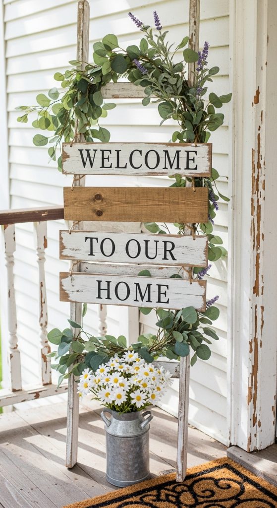A wooden ladder sign setup is unique and very Pinterest-worthy. It adds depth and charm to your porch.