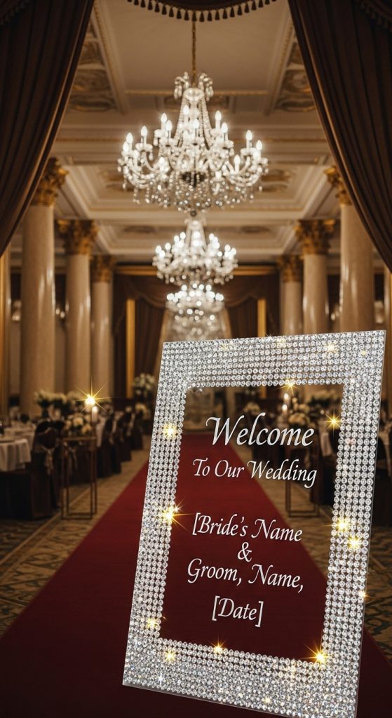 A crystal-decorated sign adds sparkle and elegance. It is perfect for grand, luxury weddings.