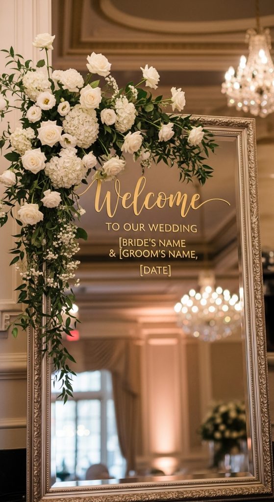 Mirror signs reflect light and add instant elegance. They are perfect for luxury or evening weddings.