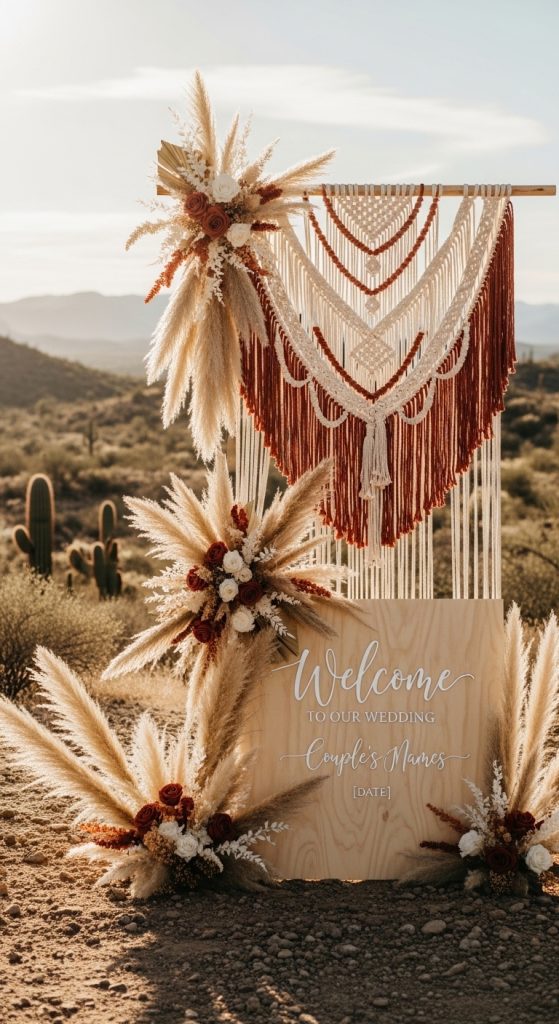 A boho macramé sign gives a soft, handmade, earthy vibe. It is perfect for outdoor and beach weddings.