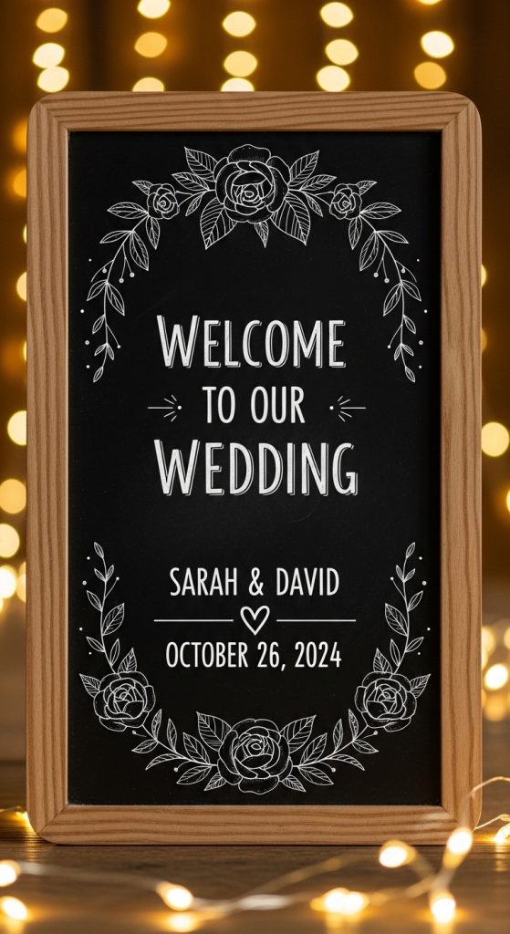 A chalkboard sign is simple, creative, and budget-friendly. It allows flexibility for handwritten designs.
