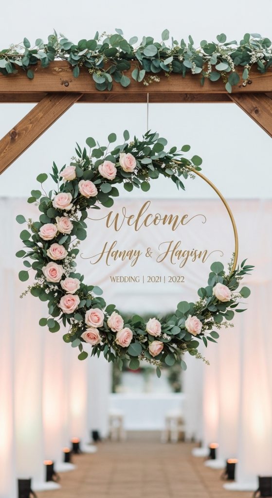 A floral hoop sign is lightweight, trendy, and very aesthetic. It works well for minimalist and romantic weddings.