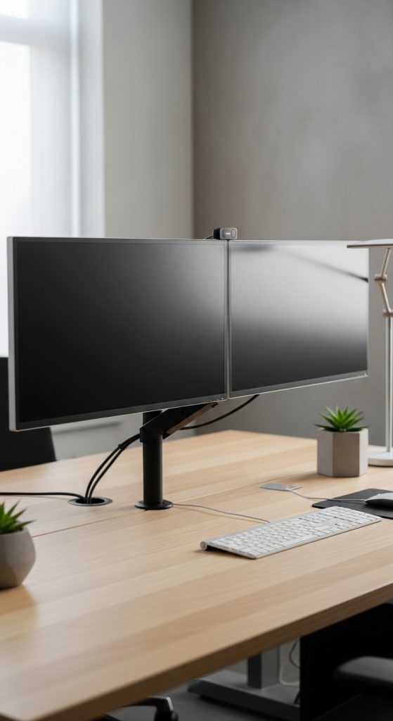 Perfect for productivity enthusiasts, a dual-monitor setup looks professional while keeping your workspace organized.